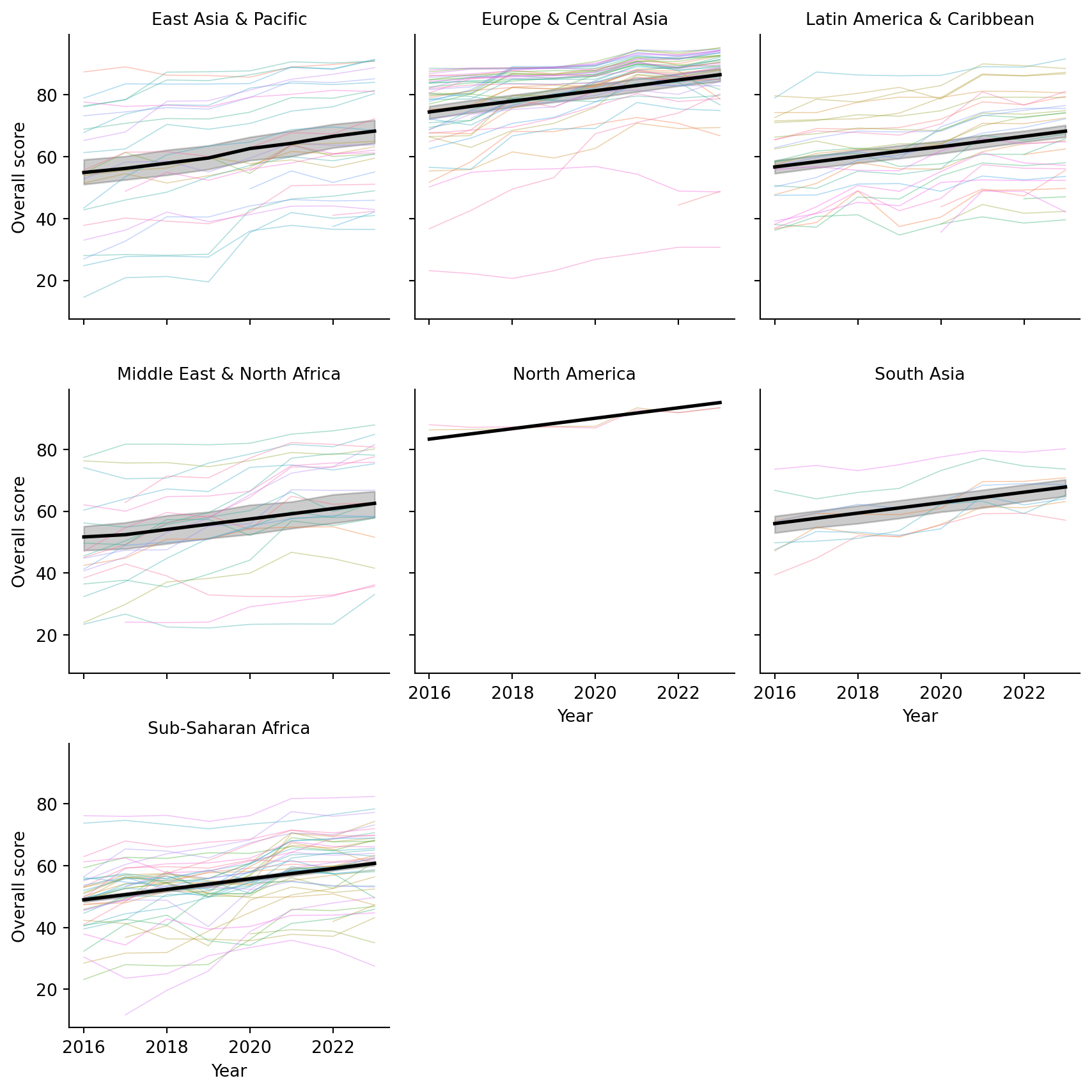 I chose to use the model with an interaction between region and income and a single pooled year trend for the final model to visualize. The following figure uses seaborn to create facets for each region. Thinner lines are shown for each country within the region, while a thicker black line shows the overall trend predicted by the regression model. The slope for each facet is assumed to be the same in this scenario, with differences in location based on the region that they are in. Differences in income are not directly shown here. Overall, we can see that some regions have higher overall scores than others, but the trend over time is generally positive across all regions. Furthermore, the fit for different regions varies, with some regions showing a tighter clustering of country-level scores around the predicted trend line, but many having variation across this trend line.